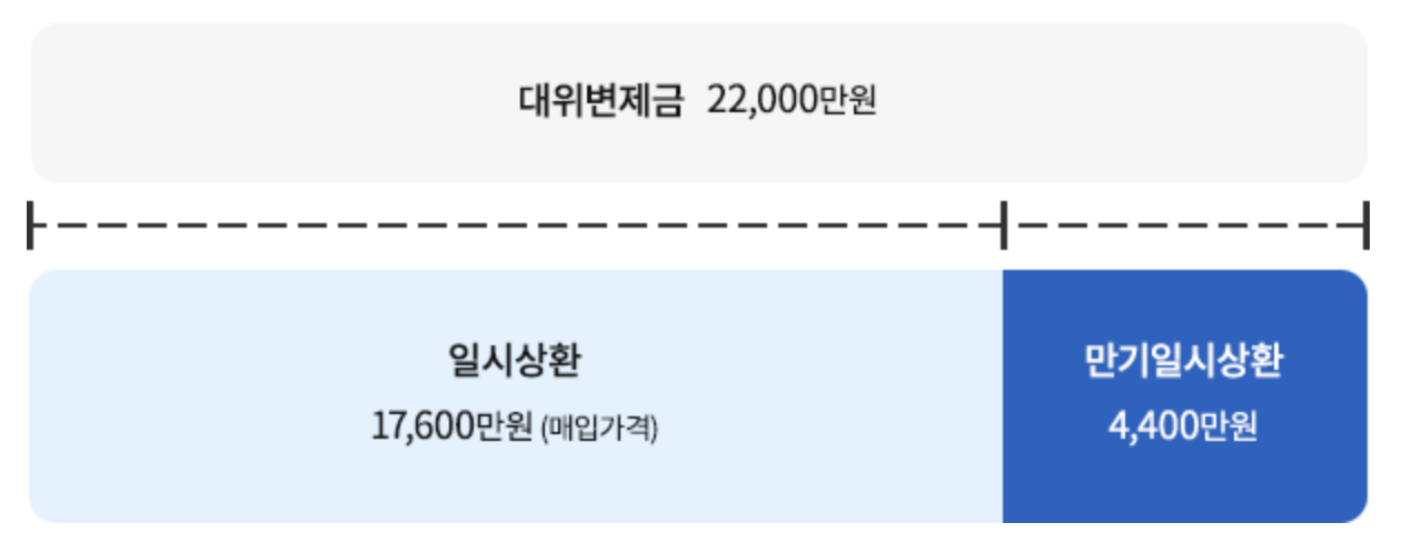 HUG가 대위변제* 주택을 매입**하여 매입가격만큼 임대인의 채무를 일시상환받고, 남은 채무(대위변제금-매입가격)는6년간 이자납부 및 만기일시상환(필요시 분할상환 가능)하는 제도